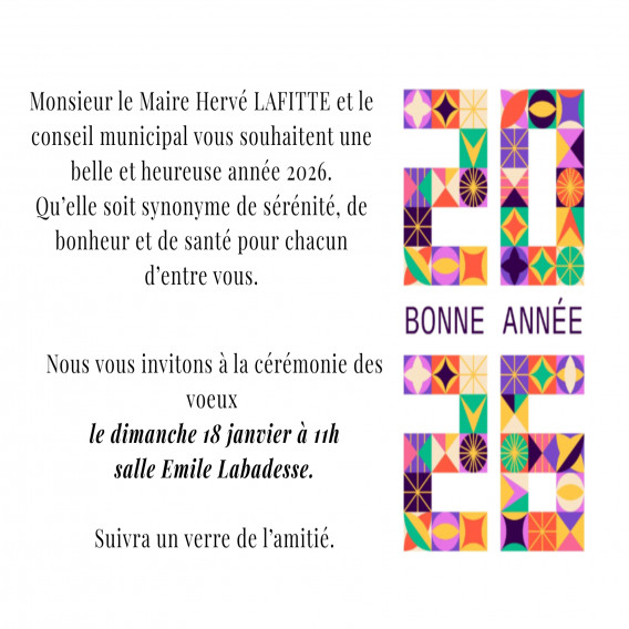 Monsieur le Maire Hervé LAFITTE et le conseil municipal vous souhaitent une bonne année et vous convient à la cérémonie des vœux le dimanche 18 janvier à 11h salle Emile Labadesse.
